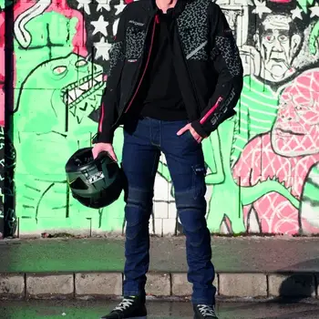 Blugi moto, concepute bărbaților. Echipament ideal atât pentru curse în oraș cât și în afară. Sunt confecționate dintr-un material special, întărit. Îmbrăcămintele fabricate din materialul denim sunt foarte populare și în grupul motocicliștilor, fiind foarte rezistente la uzură, sunt bine ventilate și au un stil unic.