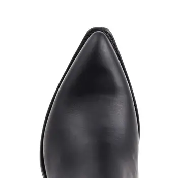Botine cowboy din piele naturală neagră, cu vârf ascuțit și toc cubanez, un model contemporan, dar cu o notă de cowboy, cu fermoar lateral pentru confort, talpă din piele cu tehnologie Goodyear.