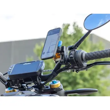 Suportul poate fi atașat de clema de frână sau ambreiaj, pe partea stângă sau dreaptă a motocicletei, iar capul de montare în interior vă permite accesul complet la toate comenzile. Capul suportului poate fi rotit la 180 de grade, oferind ajustări fine pentru unghiul de înclinare și asigurând o poziționare ideală pentru vizualizarea smartphone-ului. Cu un design minimalist și realizat din materiale rezistente, suportul se potrivește perfect pe orice motocicletă, adăugând un plus de funcționalitate fără a compromite aspectul.