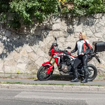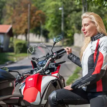 Geacă moto damă cu apariție sportivă, confecționată din piele de bovină. Este destinată motocicliștilor sport-touring. Geaca are o apariție foarte bună, dată de combinația culorilor și de aranjarea acestora. Prin căptușeala termo, geaca este confortabilă chiar și la temperaturi scăzute. Inserțiile elastice din Kevlar ajut la mișcarea liberă a conducătorului, astfel orice manevră este ușor efectuabilă. Este echipată cu protectoare de calitate cu certificare CE, care sunt schimbabile cu protectoarele SW, pe spate, coloana vertebrală este protejat de un protector de spumă absorbantă de șoc.