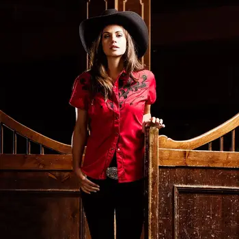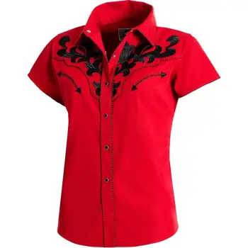 Adoptați stilul western autentic cu această bluză roșie cu mâneci scurte, creată pentru femeile care apreciază rafinamentul și detaliile bine definite. Cu o croială confortabilă și un design sofisticat, această piesă vestimentară impresionează prin broderia neagră atent lucrată de pe piept și spate, oferind un contrast elegant și un aer distinct.