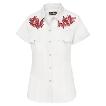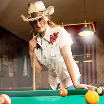 Această bluză western cu mâneci scurte îmbină eleganța cu autenticitatea stilului western, oferind un design feminin și rafinat. Realizată cu broderii atent lucrate, această piesă vestimentară pune accent pe detaliile sofisticate de pe guler, buzunare și manșete, adăugând un plus de farmec oricărei ținute.