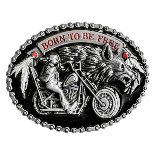 Catarama curea WILD WEST GS-413 este realizată pentru curele din piele și are un decor western cu un motociclist, un lup și cu titlul "BORN TO BE FREE".