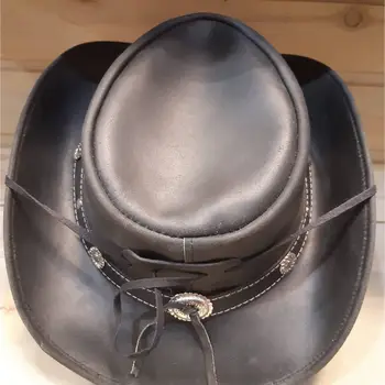 Pălăria cowboy din piele naturală WILD WEST CHONCO LFI-513 este o pălărie neagră fabricată din piele 100% naturală, de vacă. Are un decor concho și are cureaua reglabilă pentru bărbie și bordura modelabilă.