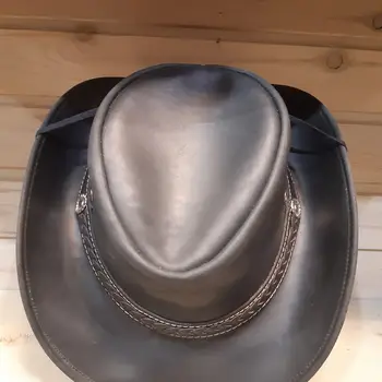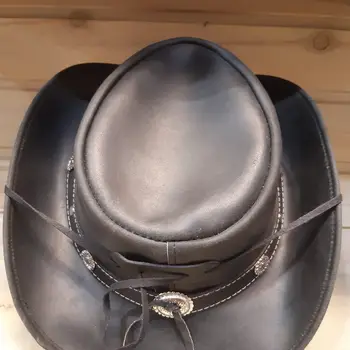 Pălăria cowboy din piele naturală WILD WEST CHONCO LFI-512 este o pălărie neagră fabricată din piele 100% naturală, de vacă. Are un decor concho și are cureaua reglabilă pentru bărbie și bordura modelabilă.