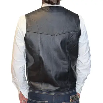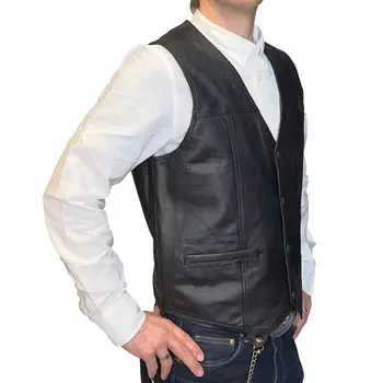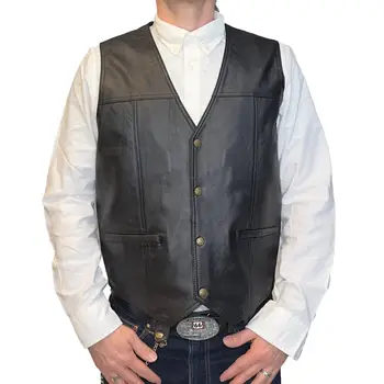 Alegeți o piesă versatilă și atemporală cu această vestă neagră din piele naturală de miel, concepută într-un stil discret, dar cu un caracter puternic. Cu un design clasic în V, închidere practică cu capse și buzunare funcționale, această vestă este alegerea ideală pentru bărbații care apreciază simplitatea sofisticată și calitatea superioară.