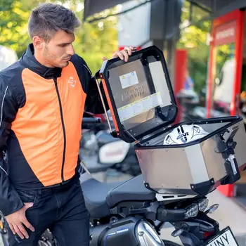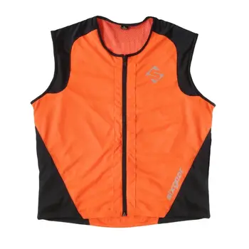 Vestă moto portocalie cu vizibilitate mărită, cu benzi reflectorizante, pentru o călătorie sigură și în timp de noapte.