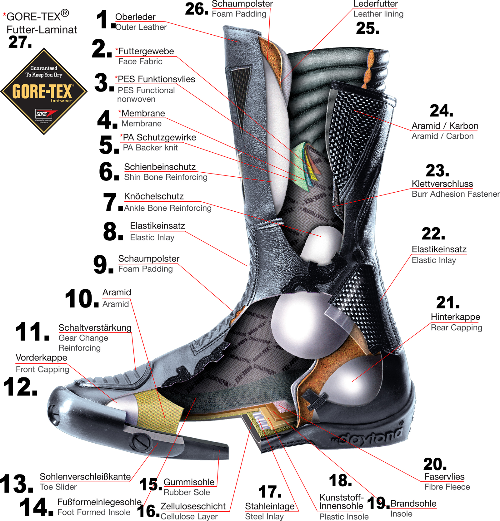 Designul sobru al încălțămintei Daytona nu trebuie să vă păcălească, deoarece ascunde o tehnologie cu adevărat specială. De exemplu, cizmele pentru competiții sunt alcătuite din peste o sută (!) de componente, astfel încât să se potrivească perfect purtătorului. Unul dintre cele mai populare modele de cizme impermeabile de la Daytona este Road Star GTX, care a câștigat numeroase teste datorită faptului că are fermoare impermeabile pe ambele părți, fiind foarte ușor de încălțat și de dezbrăcat, și, bineînțeles, că păstrează piciorul uscat și în timpul ploii torențiale. De asemenea, Daytona comercializează propriile produse pentru curățare, impermeabilizare și întreținerea cizmelor, precum și creme de reparat și de reîmprospătat culoarea, pentru a asigura o protecție îndelungată și o frumusețe durabilă a încălțămintei.