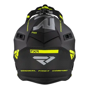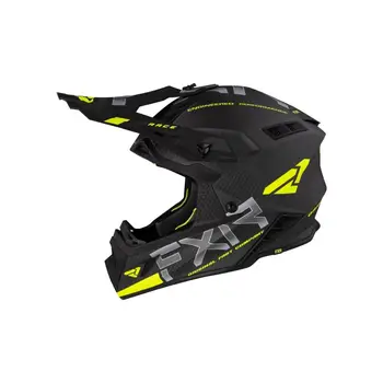 Cască Enduro - Cross - Snowmobil FXR RACING HELIUM CARBON Negru / Verde-Fluo / Gri, cu carcasă din fibră de carbon, închidere Double D-ring, EPS dual-density și ventilație High Flow 365 pentru utilizare all-season.
