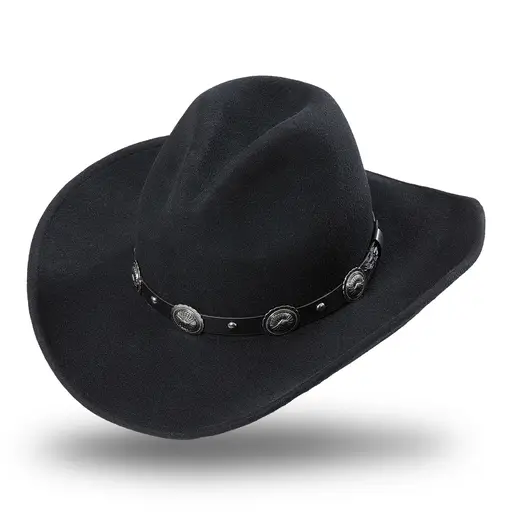 Pălărie cowboy neagră din fetru de lână modelabil, cu căptușeală, bandă premium din piele cu conchos și bandă interioară reglabilă.