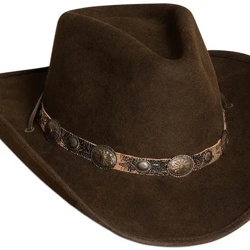 Pălărie cowboy maro din 100% lână, cu bor modelabil și decor din piele cu concho antichizat.
