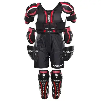 Starter Kit-ul hochei pe gheață CCM Youth este destinat copiilor și este disponibil în două mărimi, potrivite pentru vârstele de 4-7 ani și 7-9 ani. Kitul include protecții pentru umeri, coate, mănuși, pantaloni și șolduri. Nu include geanta pentru echipament.