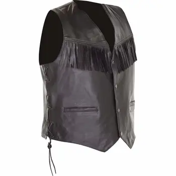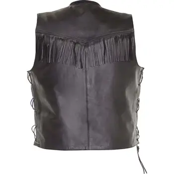 Vestă moto fabricată din piele de capră cu un finisaj de stil vintage, cu franjuri pe abdomen. Cu închidere cu butoane!